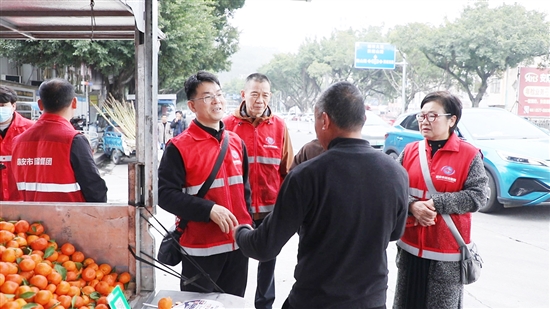 3月18日下午,记者随市民监督团来到沿江东路商城公交车站附近,只见售卖水果和蔬菜的卡车与各式小型三轮车在非机动车道上首尾相接,几乎将整条通道完全堵死,部分货车甚至侵占了公交车停靠区域。沿河人行道上,从带着泥土的新鲜蔬菜、色泽诱人的时令水果,到鲜活的海鲜水产,摊贩见缝插针,沿路一字排开,俨然形成了一个“流动市场”。