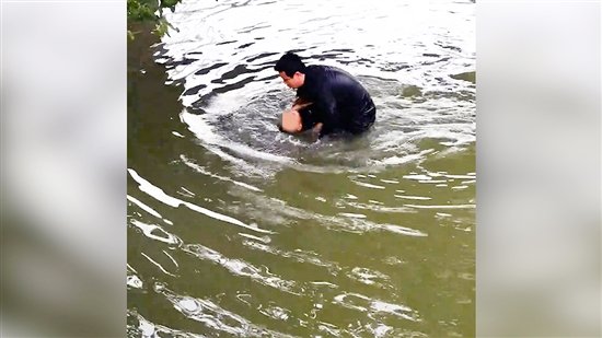 此时,一名男子循声跑到河边,看见一个小男孩正在水中挣扎,情急之下,他迅速跨过护栏,顾不上脱衣脱鞋,也没来得及掏出手机,直接跳进水中向男孩游过去。