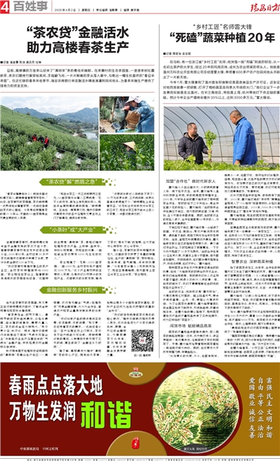 针对拥有国家地理标志证明商标的“清明早”茶高山生产地区——高楼镇,该行有效融合“气候+地理标志”开展金融保障,大力为合作社、普通农户和茶企量身定制低息的贷款产品。
