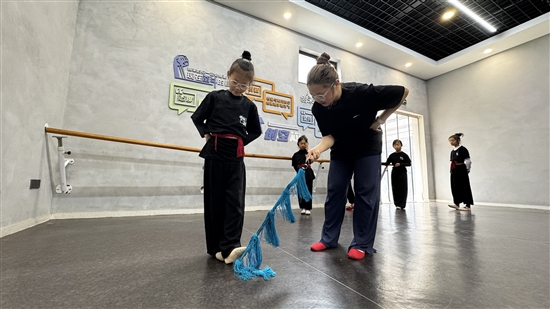 课堂上,指导老师章萱迪耐心示范、细致讲解,从脚尖扣住、脚旁擦出的基础台步,到重心前移、膝盖伸直的动作要领,手把手纠正每一个细节。“勾住的时候踩下去,脚底板分三块,一步一步往下踩。”老师的口令清晰有力,孩子们跟着节奏反复练习,从生涩到熟练,逐渐掌握戏曲基本功的精髓。