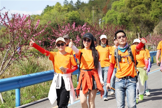 简短热烈的开幕式后,徒步队伍出发。本次徒步路线串联桃花林、梧岙水库、孙诒让故居等自然人文景观节点,全程7公里,一路风光如画。百亩桃花竞相绽放,梧岙水库碧波荡漾,古朴村落与田园景致相映成趣,让徒步之旅惬意十足。