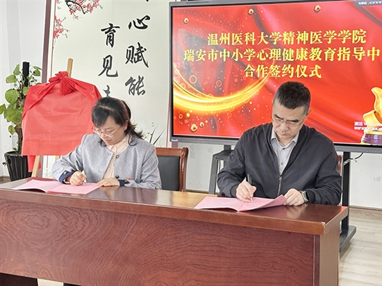 仪式上,温州医科大学精神医学学院与瑞安市中小学心理健康教育指导中心正式签署合作协议,双方将在课程建设、师资培训、个案辅导、课题研究等方面开展全方位合作。