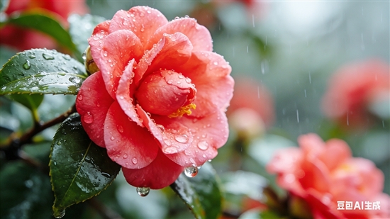 我轻轻闭起双眼,静心感受这份独特的清纯。忽然间,听到轻轻的“叭”声——原来是一朵山茶花承受不了春雨的拍打,掉在地上。